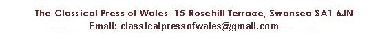 | The Classical Press of Wales, an independent venture, was founded in 1993 - initially to support the work of classicists and ancient historians in Wales, and their collaborators from further afield. It now publishes work initiated by scholars internationally, and welcomes contributions from all parts of the world. Since 2003 CPW has included Egyptology in its list of specialisms. CPW has a commitment to clear writing and to traditional forms of argument. They are produced to be elegant and to last. Most are printed on fine-blade cartridge paper, and sewing is used in the binding. Our books are also noted for their layout and typography, which have been the responsibility of Ernest Buckley, M.A, B.Litt, ably succeded by Louise Jones of Gomer Press. Our sole distributor in North America is ISD Distribution. Our distributor for Britain, Europe and Rest of World is the Mare Nostrum Group | ||||||||||||||||||